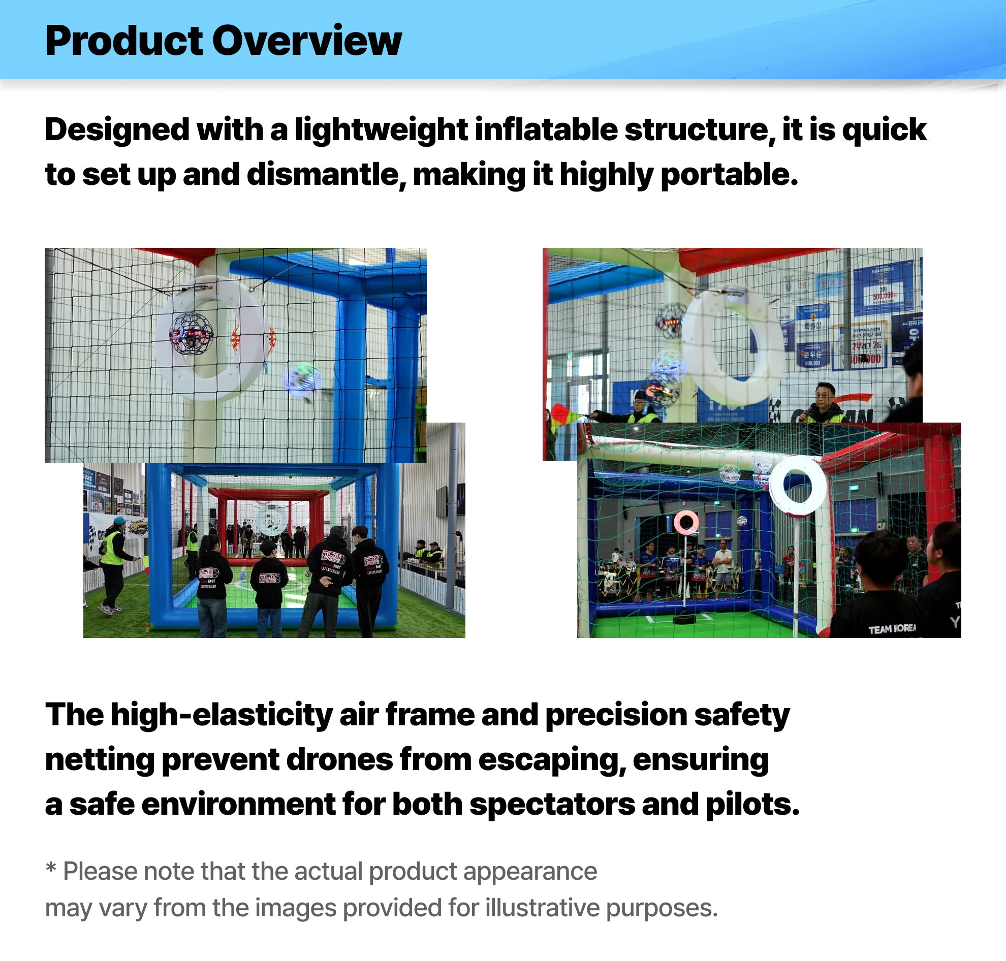 Enhanced Safety: The high-elasticity air frame and precision safety netting prevent drones from escaping, ensuring a safe environment for both spectators and pilots.