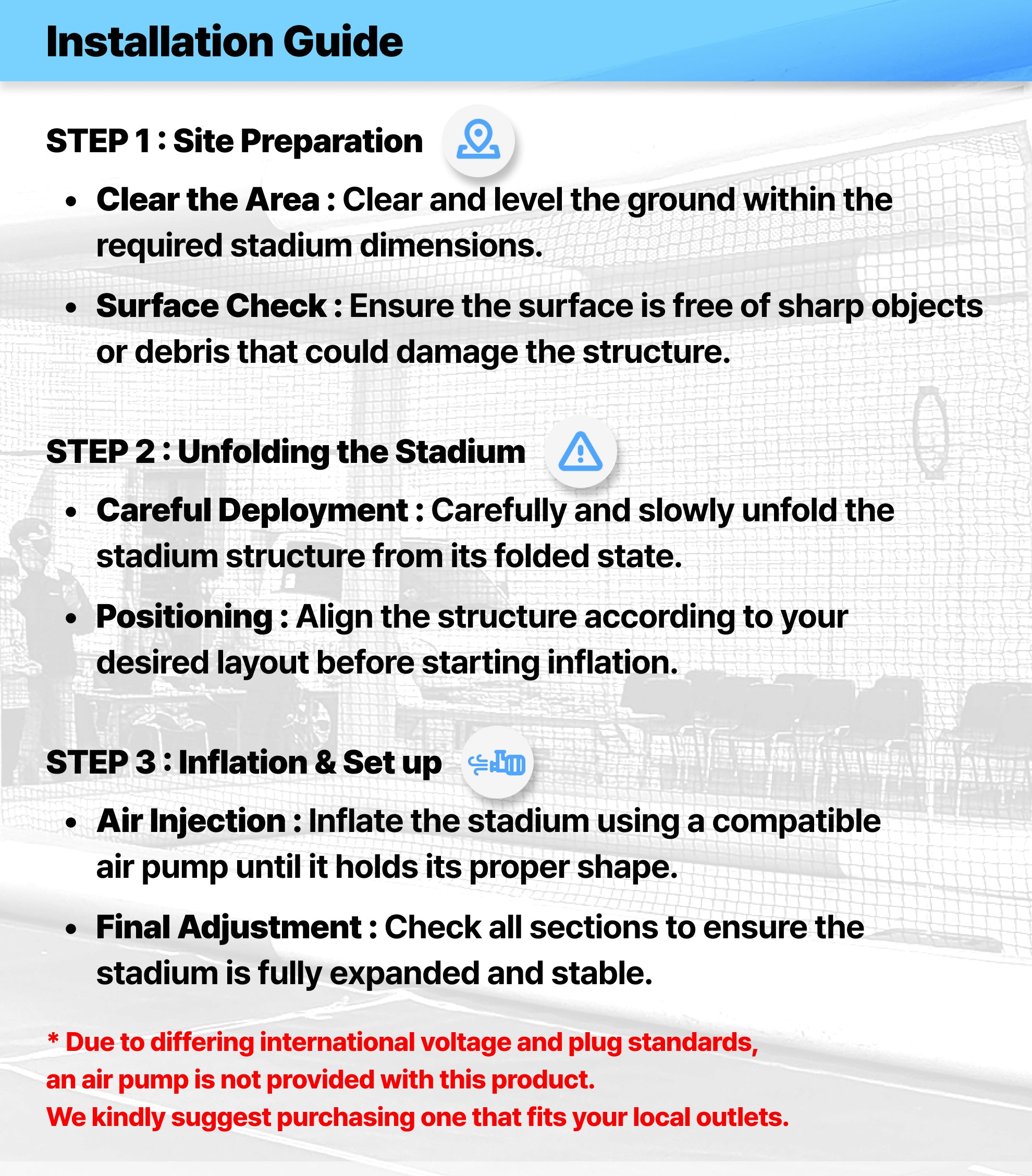 Air Injection: Inflate the stadium using a compatible air pump until it holds its proper shape.