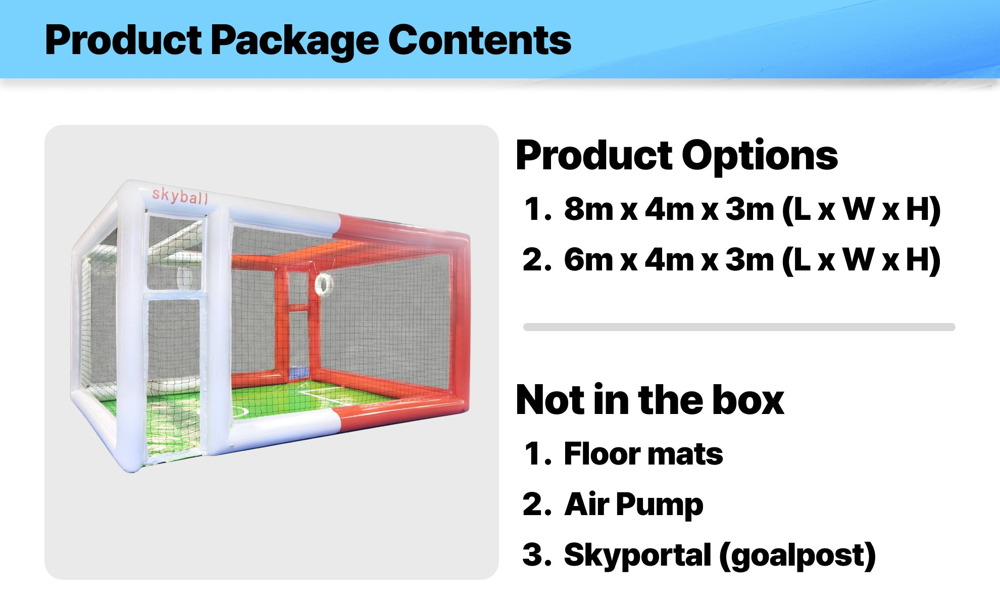 Not Included in the Box: Floor mats, Air Pump, and Skyportals (goalposts) are not included and must be purchased separately.
